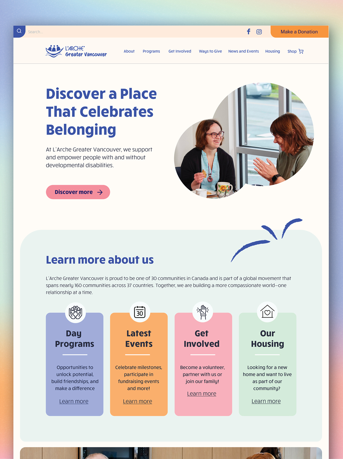 In 2025, L’Arche Greater Vancouver committed to updating their website, and we rolled up our sleeves and got to work. Our creation is bright, bold, visually ambitious, and — above all else — welcoming.
